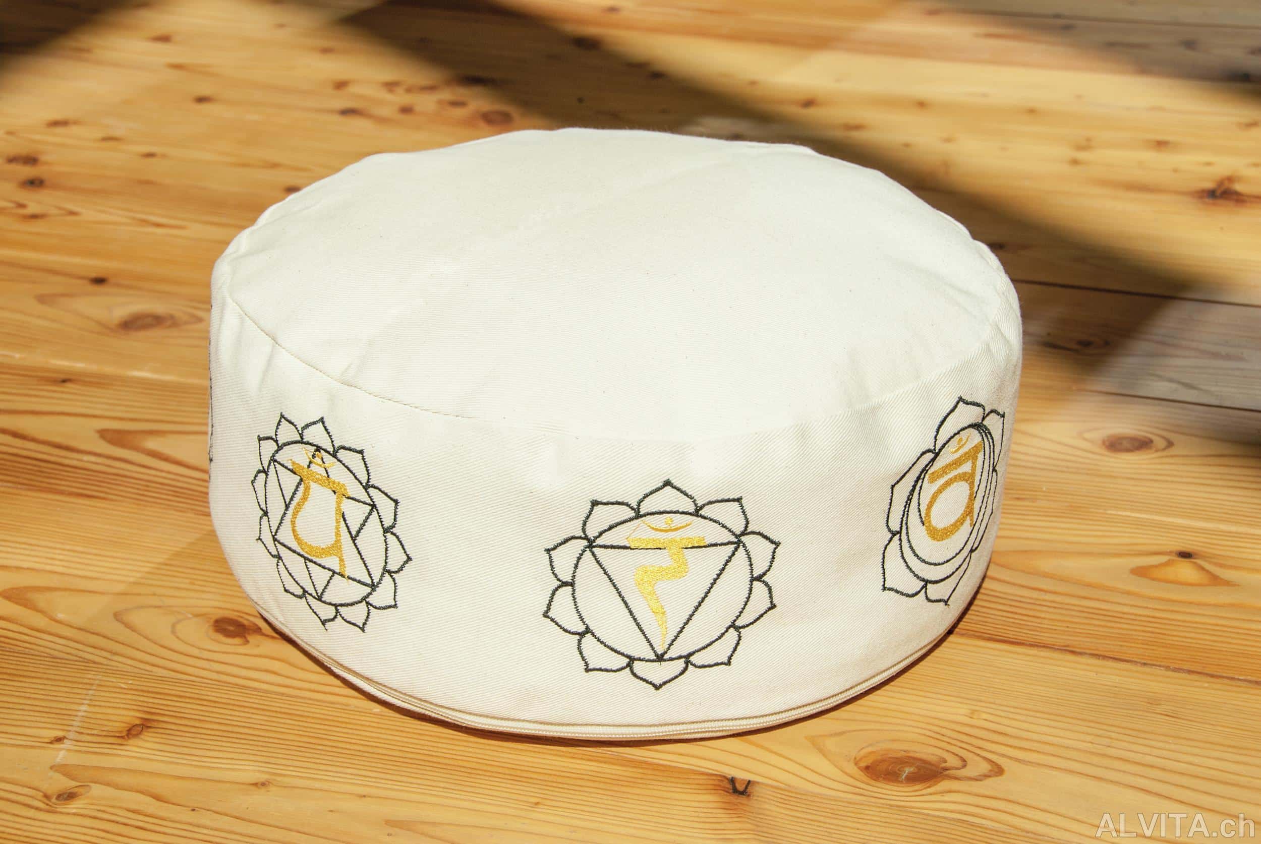 Meditationskissen 7 Chakra weiss mit Stickerei schwarz und goldgelb